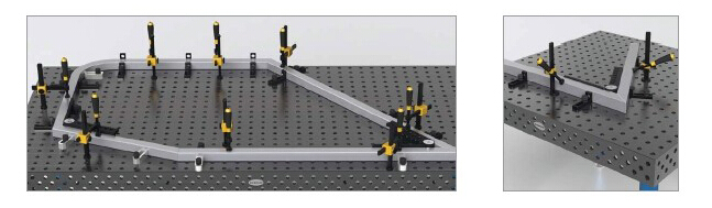 角度器可連續(xù)調(diào)節(jié)0°~180°之間的任意角度,從側(cè)面圓盤(pán)刻度上讀數(shù),當(dāng)調(diào)節(jié)到所需要的角度時(shí),擰緊側(cè)面的夾緊螺絲即可。兩夾角臂上分別有系統(tǒng)孔和槽,可以在孔和槽中連接其他定位夾具模塊用于定位或夾緊。